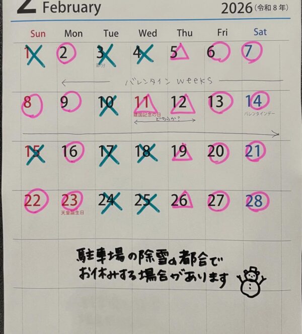 2月は火,水曜日と、第1第2日曜日も定休日です。