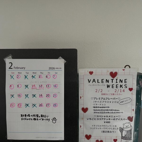 BLOG 今日も晴れですがおやすみです 2026年2月15日 nina 土曜日の昨日は暖かくてたくさんの方にお越しいただきありがとうございましたお出かけしたくなる陽気でしたよね 今日も晴れですがおやすみいただきます。 バレンタインウィークも,おかげさまで限定フレーバーはビターチョコを残して完売、ビターチョコは明日以降引き続きでています。 イチゴとココアクッキーのアイスバーは月曜日くらいまでにあと少しだけあるのでご入用の方はこちらからご連絡いただけばお取り置きします^ ^ 良い日曜日を‼︎ Follow me! FacebookXBlueskyHatenaCopy